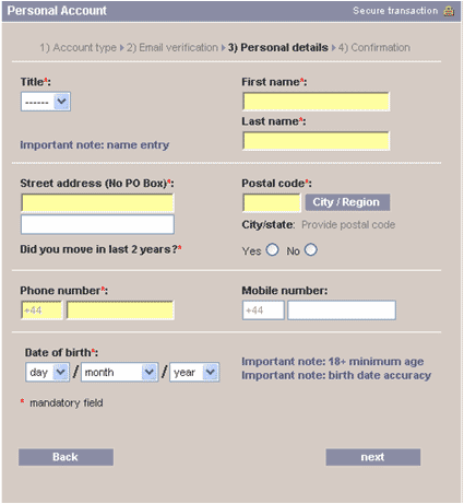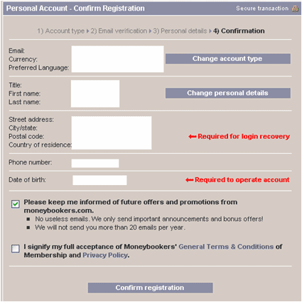 Moneybookers kræver følgende oplysninger for at sikre din identitet.