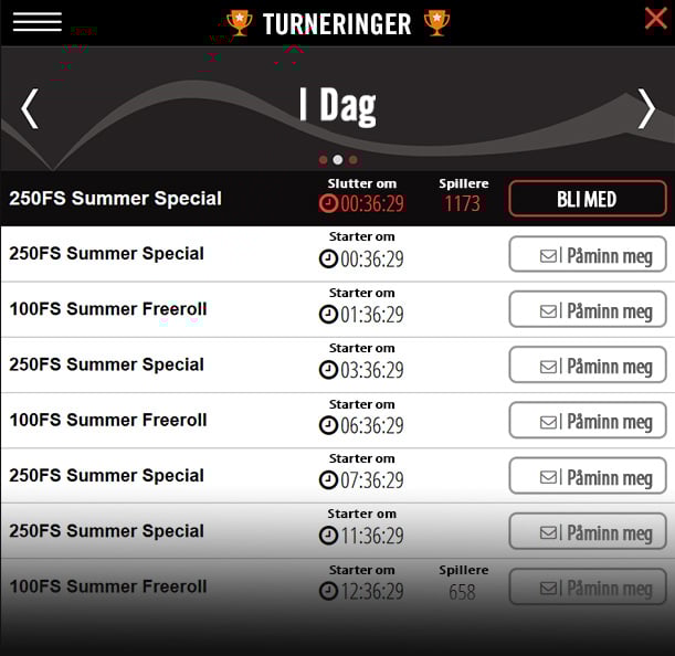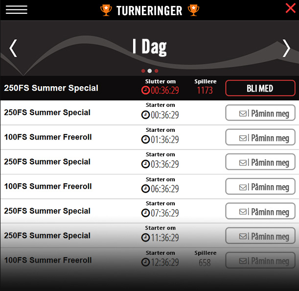 Gå inn på gratisturneringene: Trykk på knappen med "delta". Den gir deg turneringsspinn til bruk i gratisturneringen.
